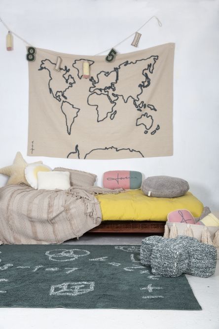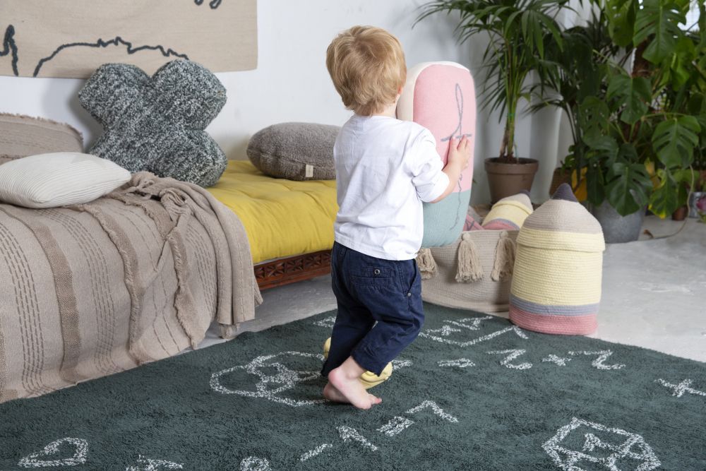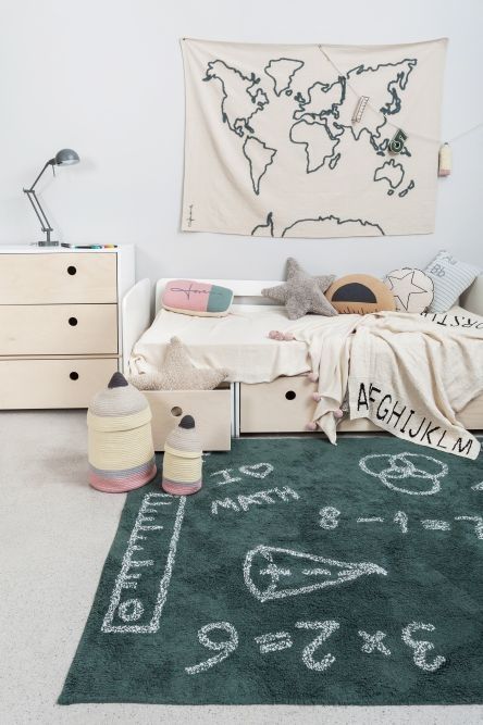 Tmavě zelené a bílé tóny, zvolené pro tento koberec, připomínají tabuli a křídu. Díky neutrálnímu designu je koberec vhodný do holčičích i klučičích pokojíčků. Motiv poje vhodný jak pro malé děti, tak pro školáky.