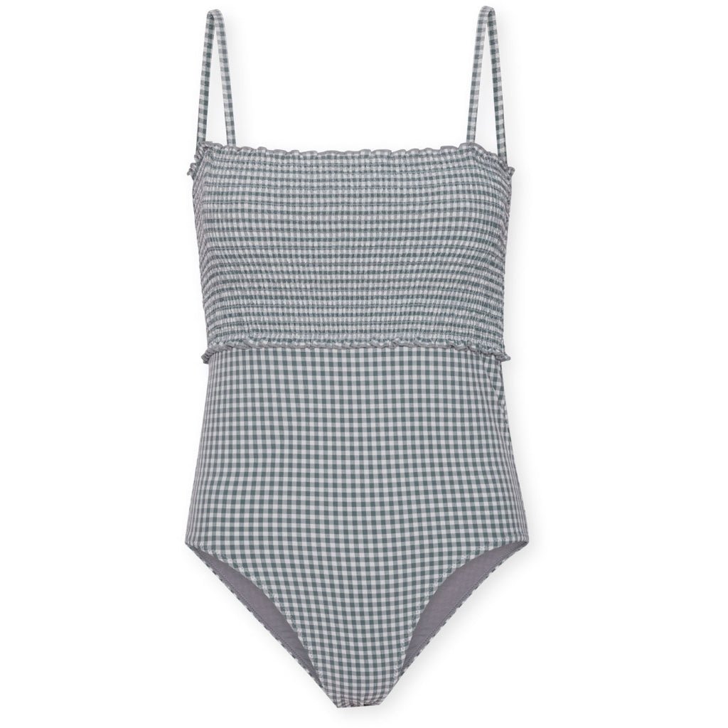 Plavky Konges Slojd s odepínacími ramínky se stylovým žabičkováním v oblasti dekoltu, díky němuž se plavky krásně přizpůsobí. Dá se v nich i snadno kojit. Plavky jsou celé podšité, s jemným "seersucker" (zvrásněným) efektem ve spodní části.