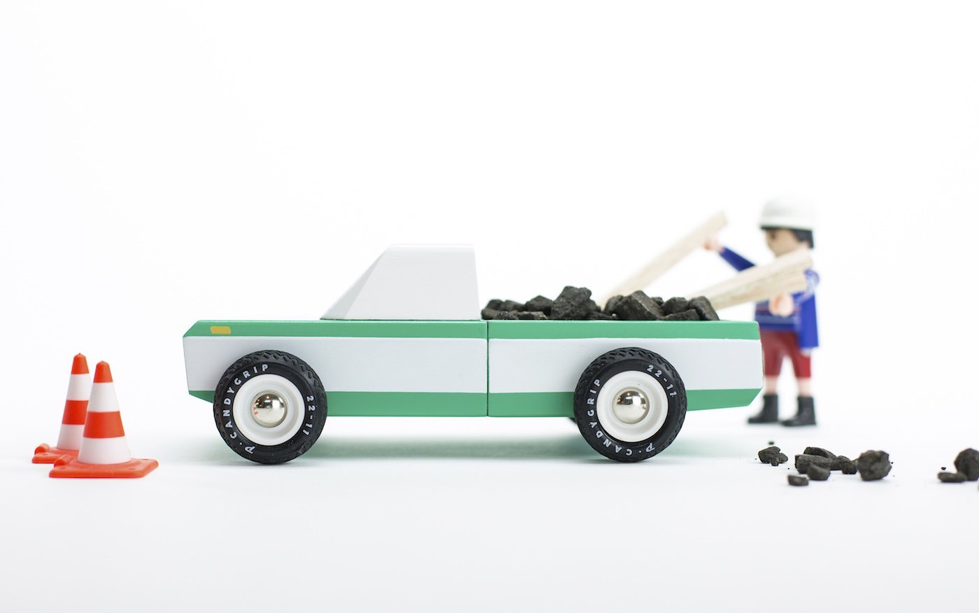 Dřevěné auto s gumovými pneumatikami. Americký pick-up s otevřenou korbou, připravenou převézt jakýkoli náklad.