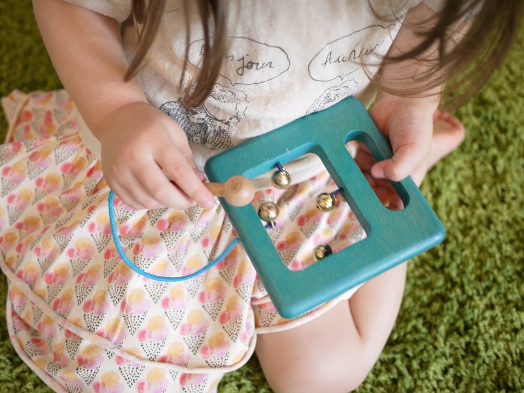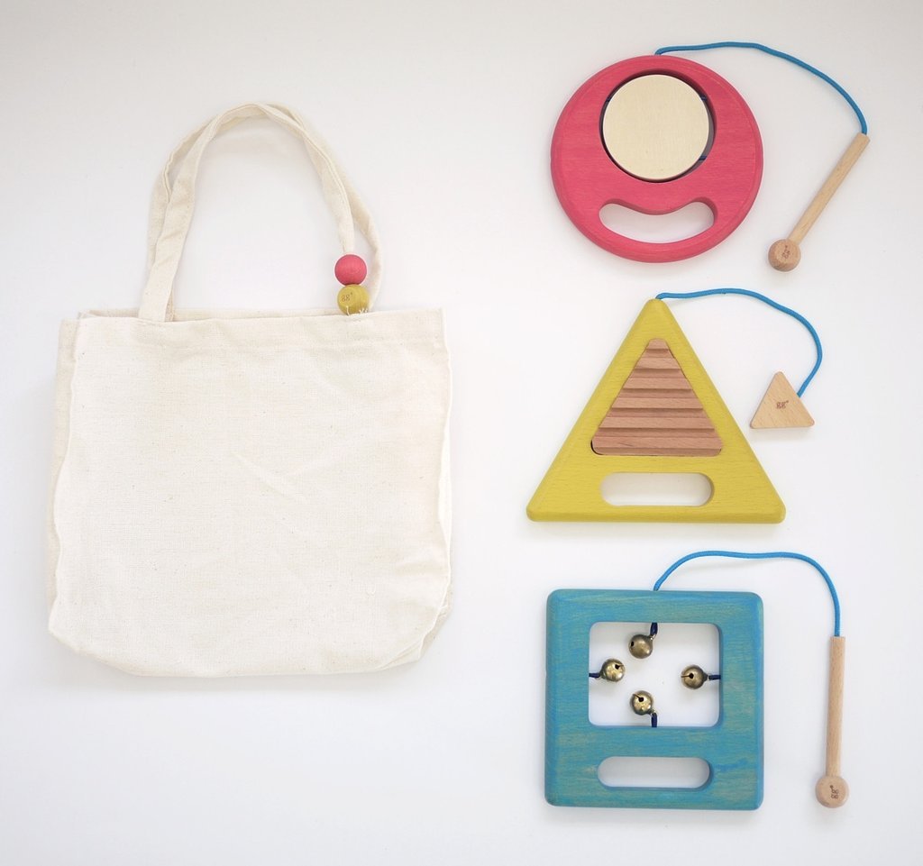 Tři různé hudební nástroje, tři druhy zvuků. Set tvoří kulatý bubínek, triangl a čtvereček s rolničkami. Hračky imitující hudební nástroje rozvíjí u dětí cit pro vnímání rytmiky i hudby obecně.