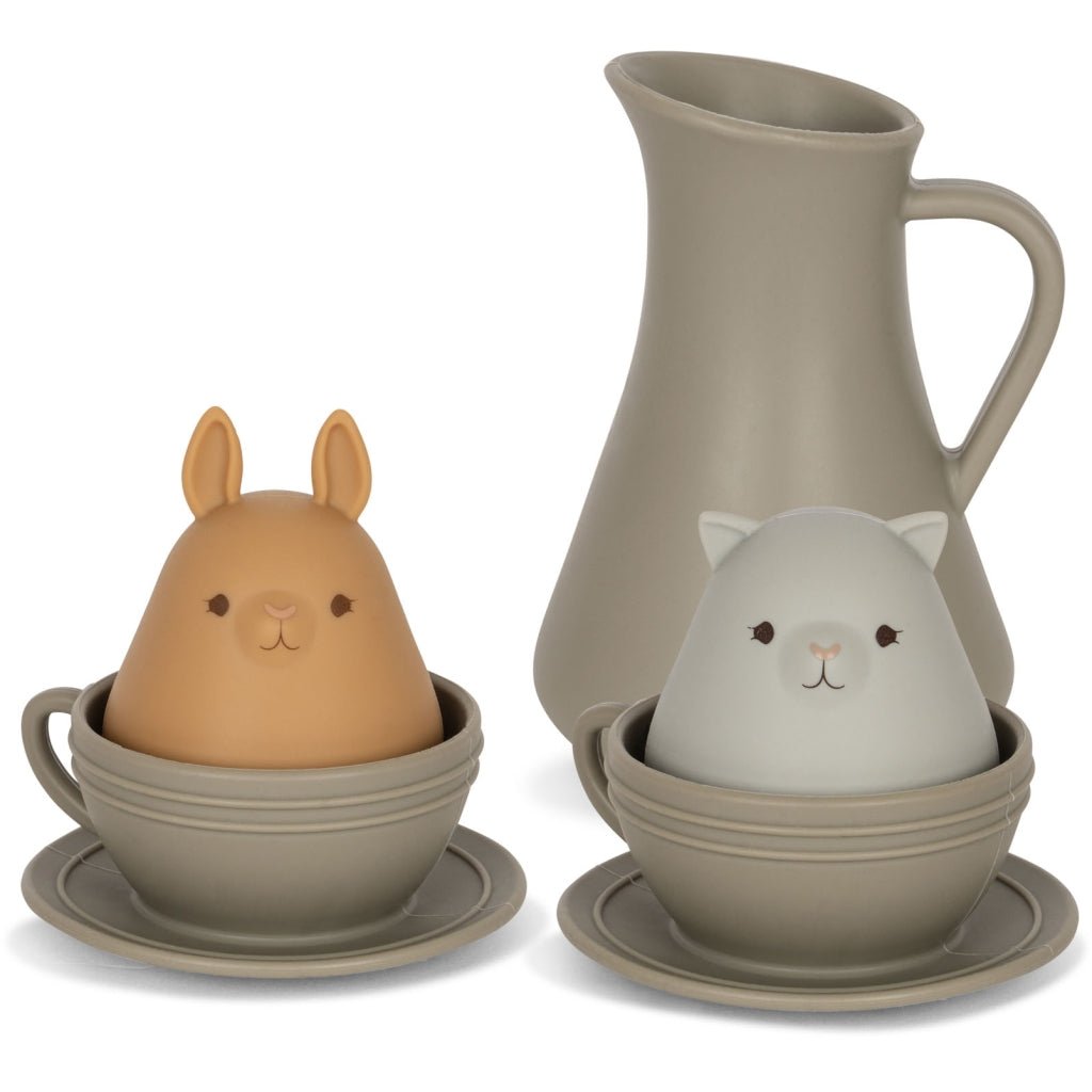 Aby bylo koupání veselejší. Dvě zvířátka, konvička a dva šálky, protože snad všechny děti ve vaně rády nalévají, přelévají a servírují "kafíčko nebo čajíček". Hrajte si, trénujte motoriku rukou. Hračky ze 100% silikonu.