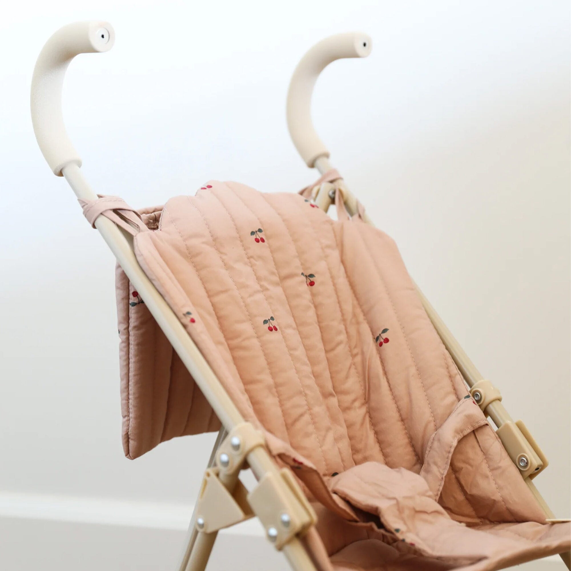 Kočárek pro panenky Konges Slojd. Stabilní, s dvojitými koly. S postrojem, aby panenka nepadala, a s taškou na všechny nezbytnosti. Tkanina ze 100% organické bavlny je snímatelná. Kočárek se dodává sestavený, složený. Snadno se skládá.