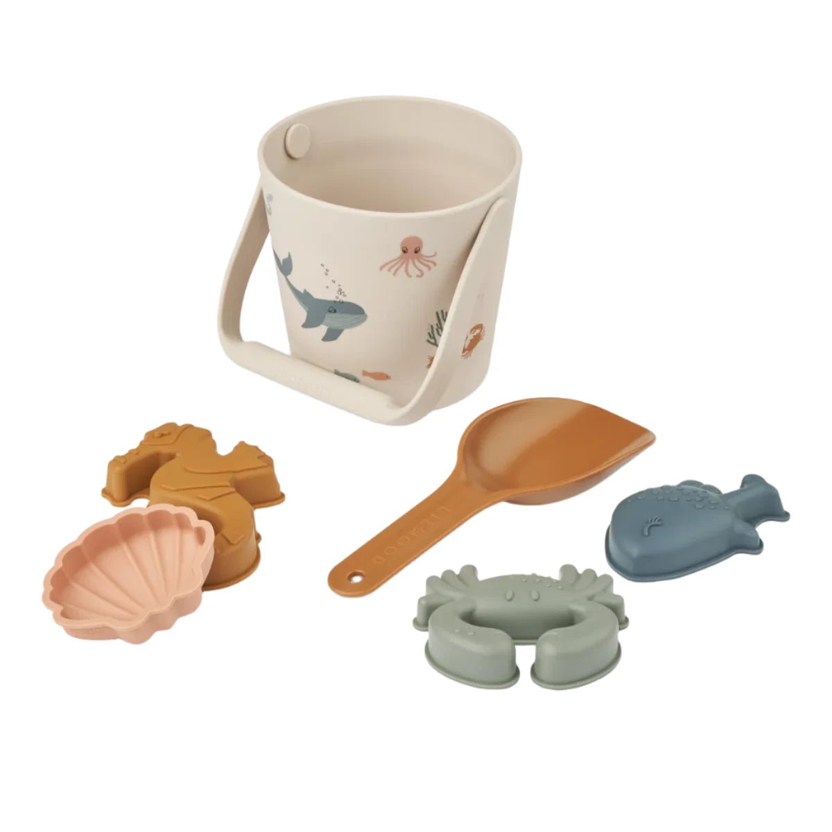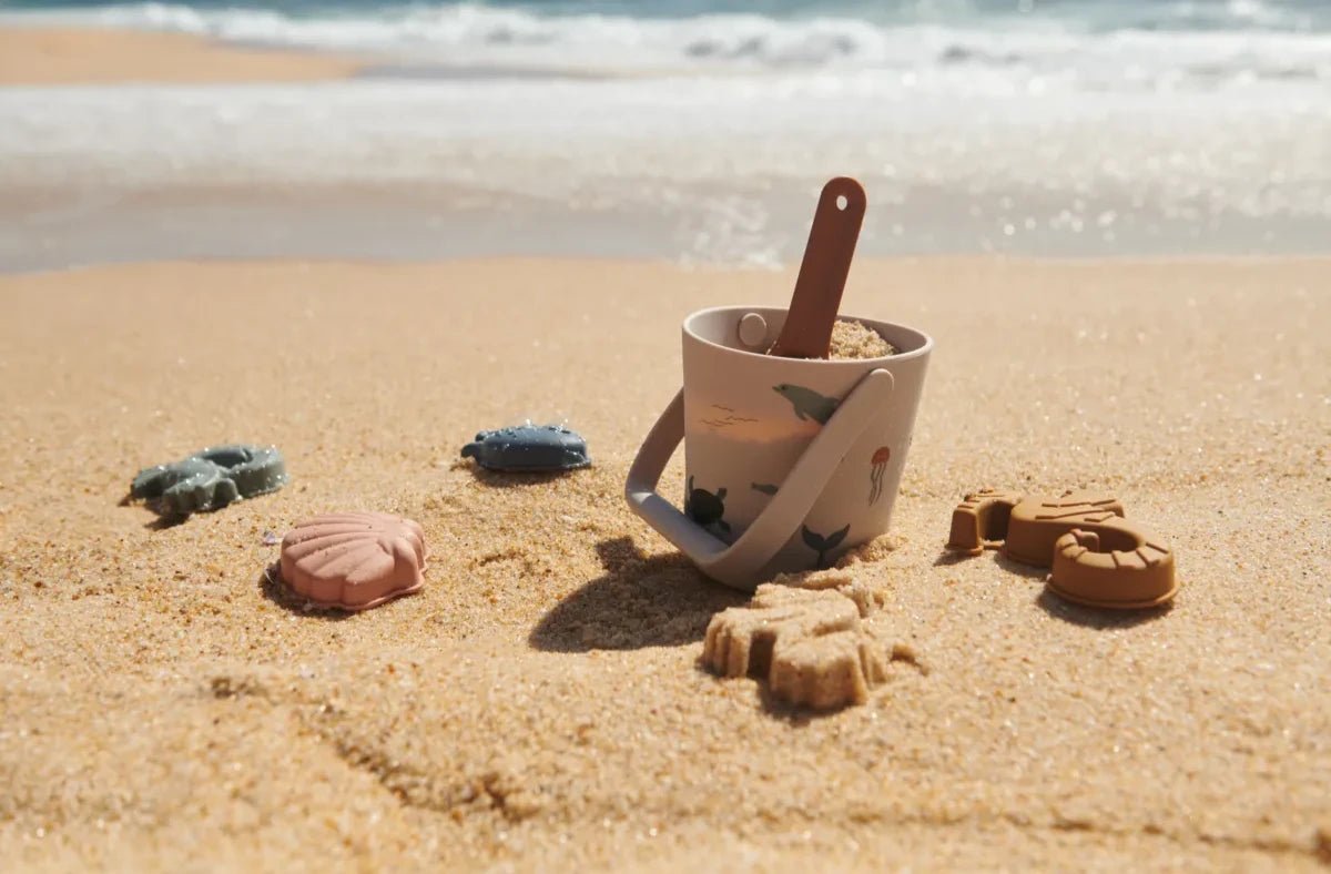 Čeká vás den na pláži, u vody, nebo vaše děťátko miluje písek a na pískovišti jste víc než doma? Pak je pro vás plážový set Liewood perfektní a stylovou volbou. Set tvoří kyblíček s rukojetí, lopatka a čtyři bábovičky ve tvaru zvířátek podmořského světa.