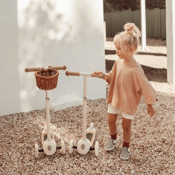 Se stylovým proutěným košíkem (který se však dá snadno sundat, pokud by se vám koloběžka více líbila bez něj). Koloběžka má nastavitelnou výšku řídítek ve tvaru písmene T. Ovládá se nakloněním řídítek do stran - děti způsob ovládání velice snadno pochopí a jízdu na koloběžce si maximálně užívají. Díky třem kolečkům koloběžka samostatně stojí, čímž odpadá problém s opíráním po dojezdu.