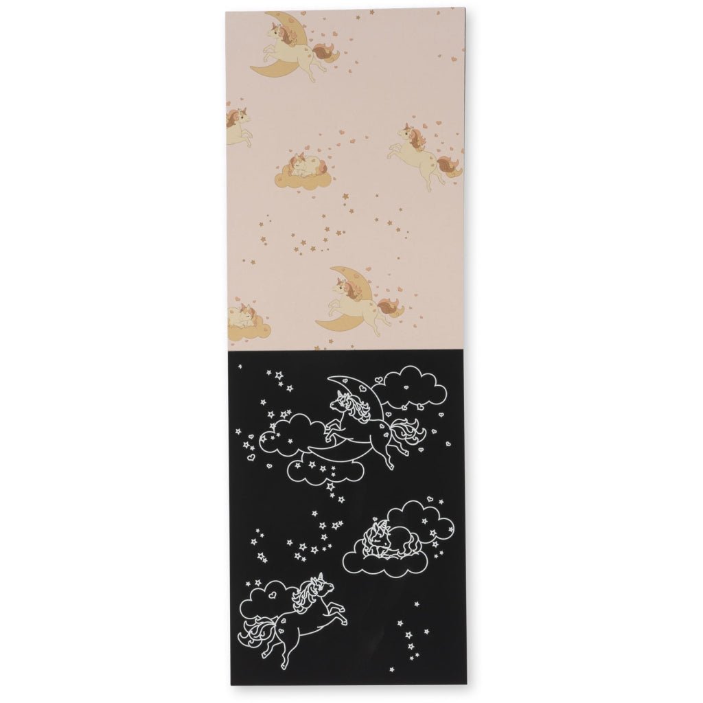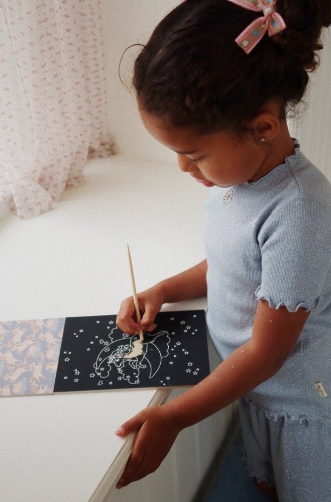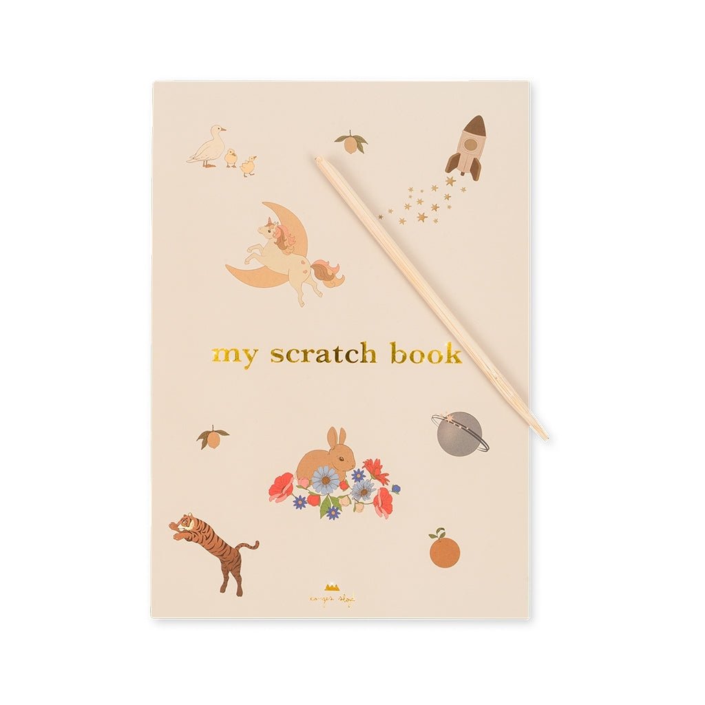 Knížka s vyškrabávacími obrázky pro děti od 4 let. Patnáct jedinečných kreseb v designu Konges Slojd, které děti přiloženým bambusovým perem vyškrabou. Knížka je vhodná na doma a skvělá na cesty.