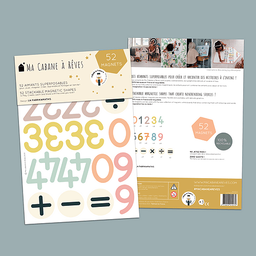 Magnetické tabulky a magnety se prodávají samostatně. K jedné tabulce můžete vybrat více sad magnetů. Magnety Ma Cabane à Rêves fungují na jakékoli magnetické plochy v bytě (ledničku, kovové zárubně dveří, topení, plochy natřené magnetickou barvou apod.).