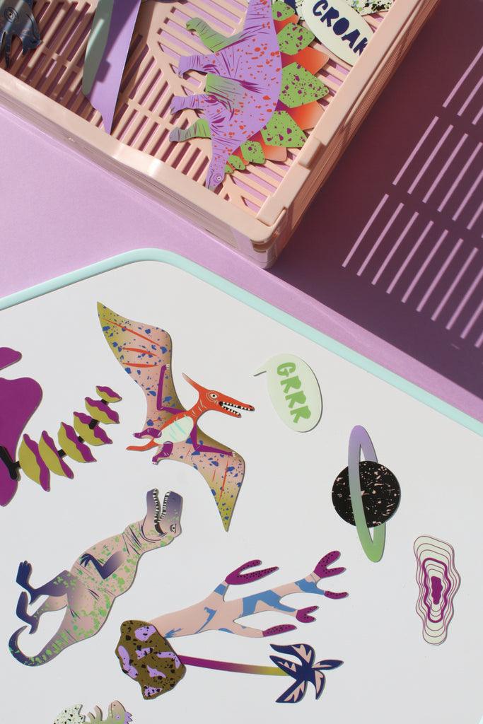 Sada obsahuje 37 magnetických obrázků dinosaurů a jejich prostředí. Magnety jsou tenké a dají se vrstvit, díky tomu si můžete složit celou řadu variací na téma "dino".