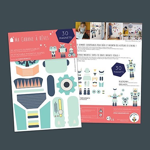 Sada obsahuje 30 magnetických obrázků, ze kterých postavíte řadu robotů. Magnety jsou tenké, dají se vrstvit, díky tomu si můžete složit celou řadu variací na téma robot. Tato sada byla speciálně navržena pro chlapečky a jejich tatínky.