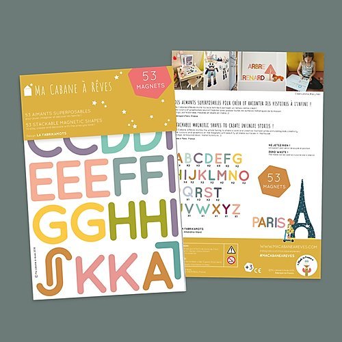 Magnetické tabulky a magnety se prodávají samostatně. K jedné tabulce můžete vybrat více sad magnetů. Magnety Ma Cabane à Rêves fungují na jakékoli magnetické plochy v bytě (ledničku, kovové zárubně dveří, topení, plochy natřené magnetickou barvou apod.).