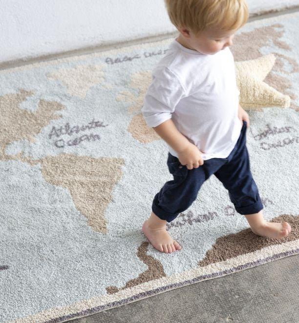 V běžné pračce pratelný koberec španělské značky Lorena Canals s mapou světadílů a oceánů.