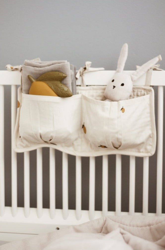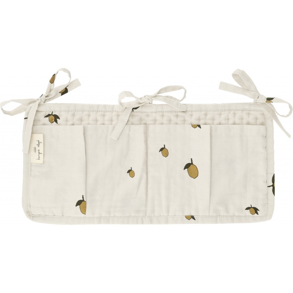 Praktický kapsář na postýlku miminka, do kterého uložíte nezbytnosti potřebné ke klidnému odpočinku děťátka - dudlíky, plenku nebo drobné hračky - zkrátka vše, co potřebujete mít po ruce. Kapsář se dvěma kapsami se šňůrkami přivazuje na postýlku.