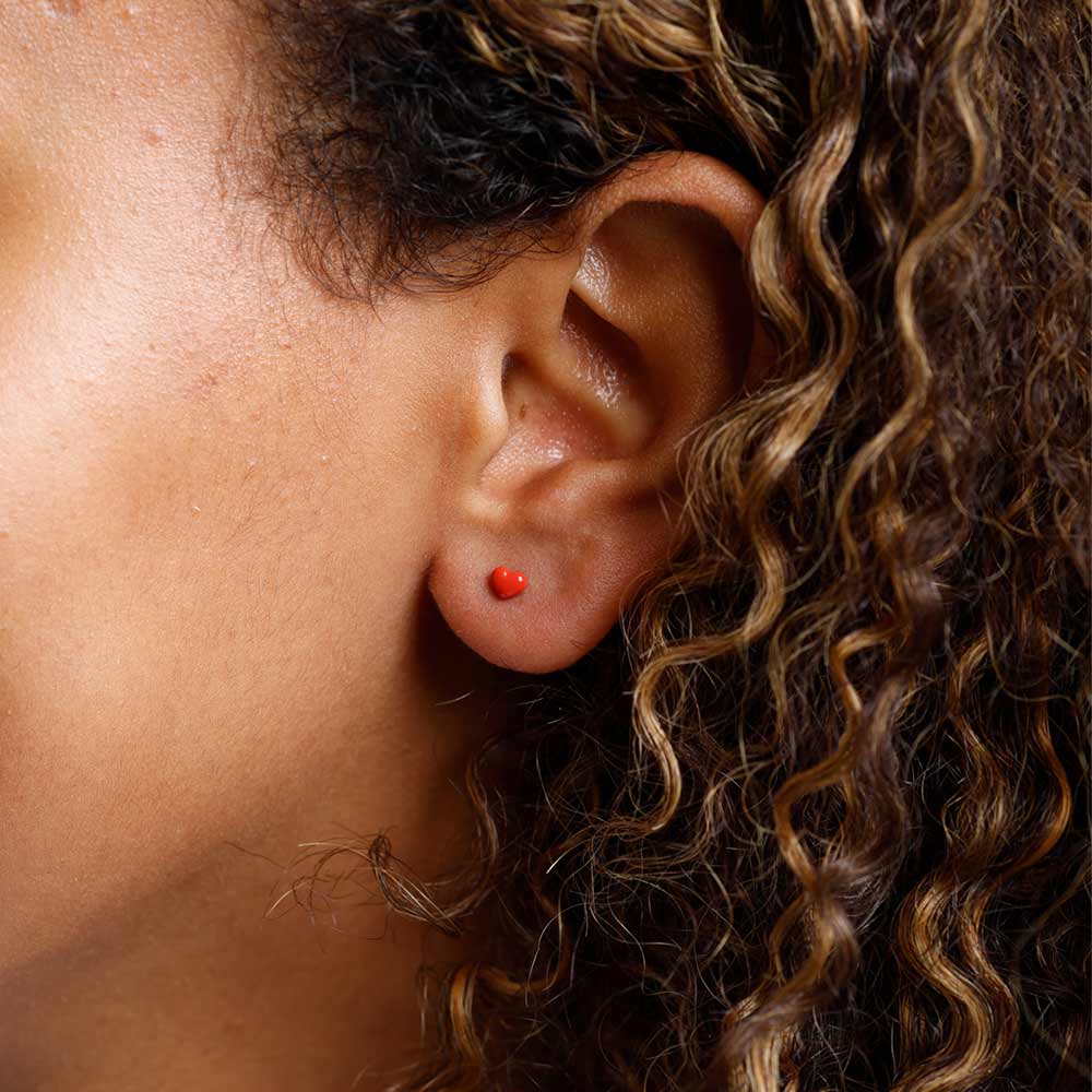 Náušnice z kolekce Little Big Love. Minimalistické a zároveň krásné šperky s malým červeným srdíčkem.