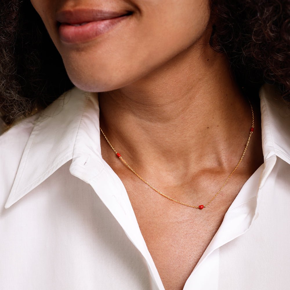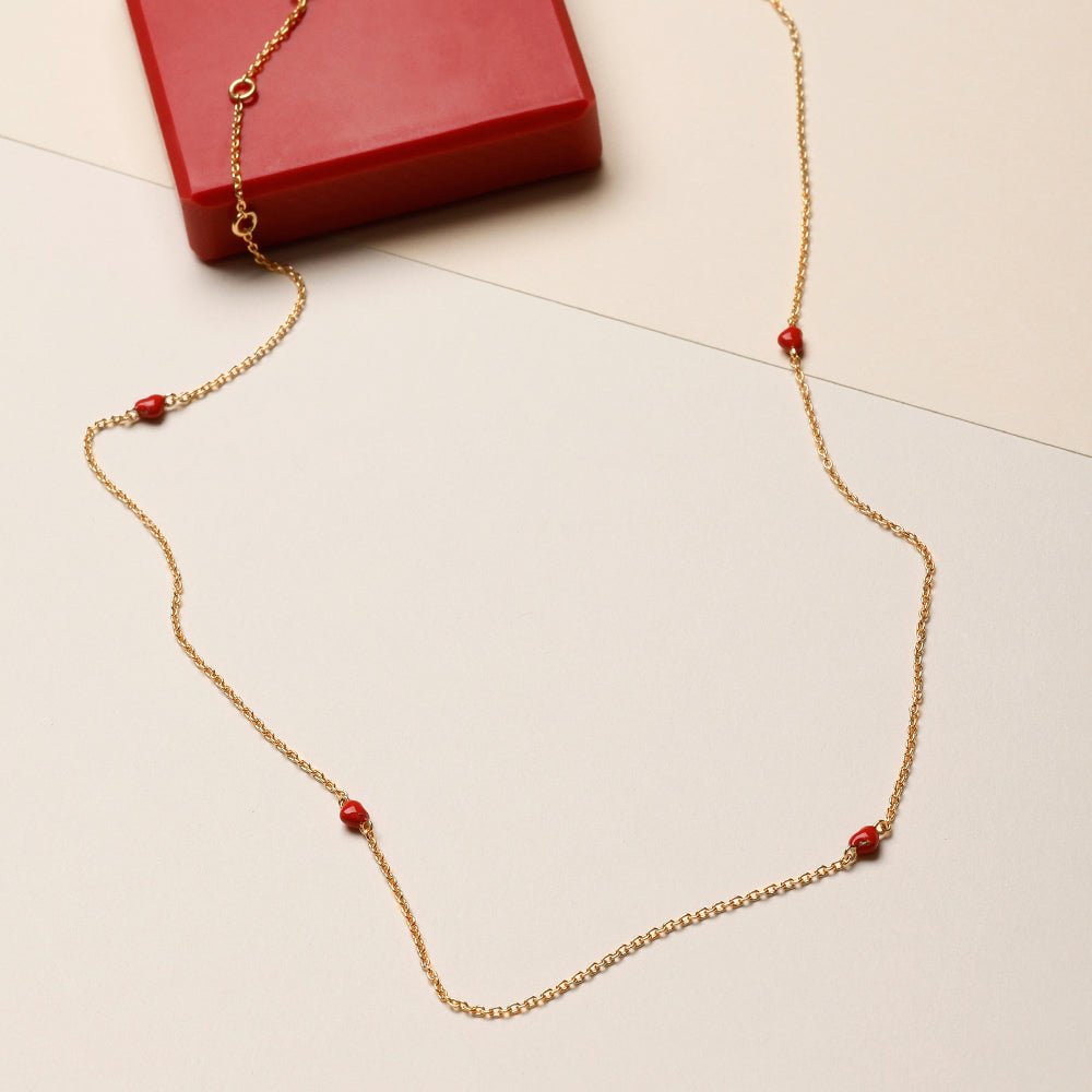 Krásný šperk s atraktivními detaily malých červených srdíček. Z kolekce Little Big Love. Velikostně nastavitelný - zapínání ve třech délkách. Ženský, působivý sám o sobě, nebo ještě osobnější v kombinaci s přívěskem Design Letters s písmenem.