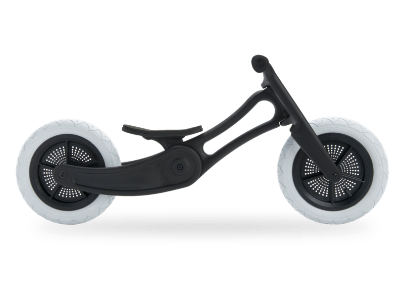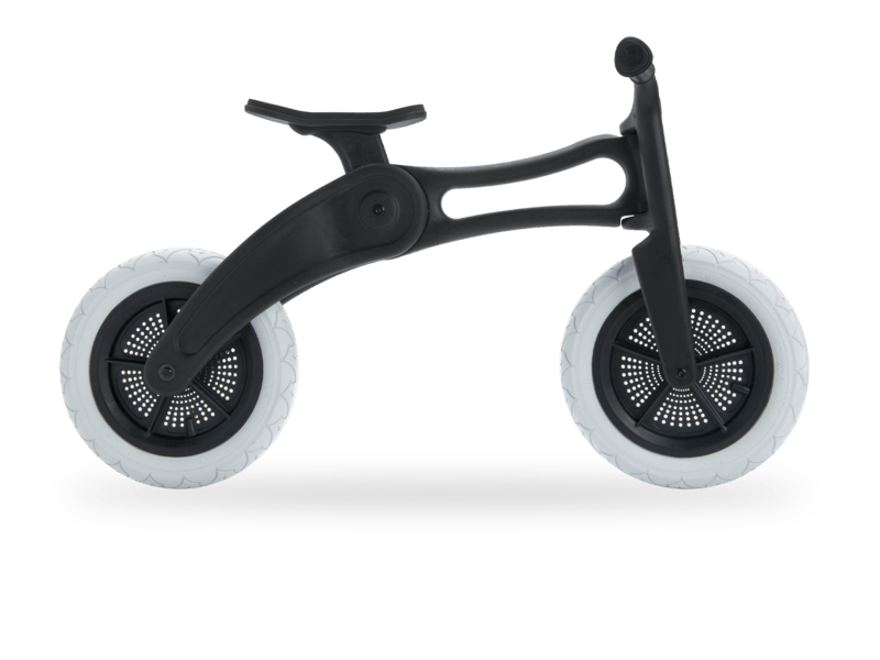 Odrážedlo Wishbone 3v1 RE2 v černé barvě je na pohled identické jako jeho předchůdce, verze RECYCLED. Rozdíl je v použitých materiálech. Zatímco RECYCLED je celé vyrobeno z materiálu z recyklovaných kobercových vláken, verze RE2 kombinuje části z recyklovaných kobercových vláken a části z recyklovaných lahví. Části z recyklovaných lahví se dají dále snáze recyklovat.