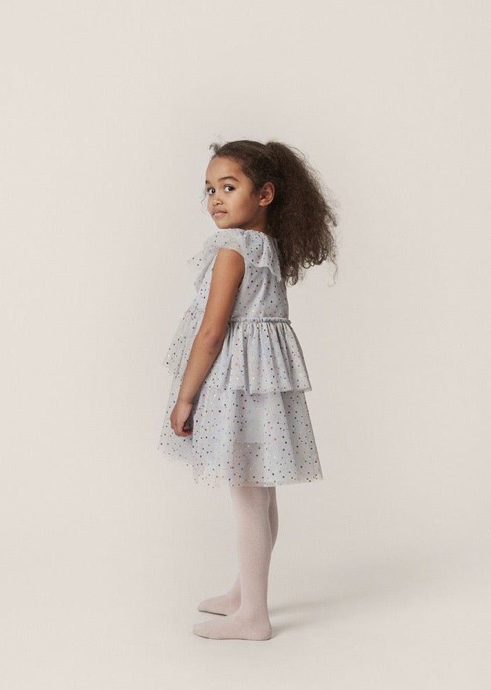 Slavnostní tylové šaty s třpytivým potiskem a volánovými detaily. Zapínání na perleťový knoflík vzadu, bavlněná podšívka. Když chce být vaše holčička za princeznu.