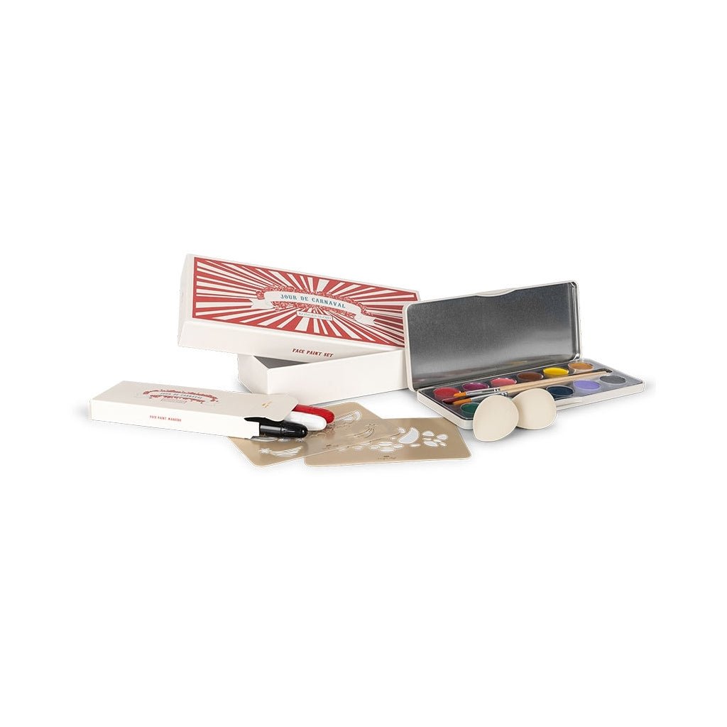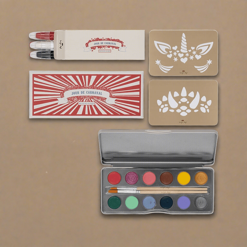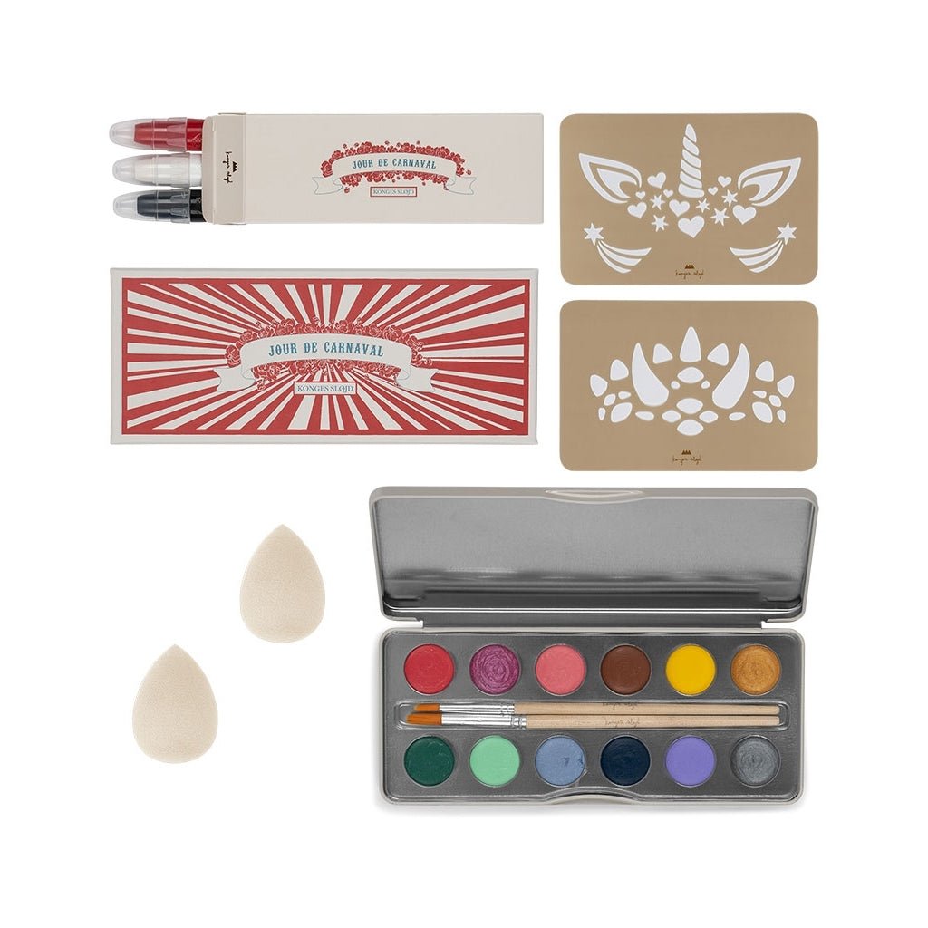 Sada na malování na obličej a tělo. Zábavná a kreativní hra pro vaši malou parádnici. Set obsahuje kromě barev a krajónů i dvě opakovatelně použitelné šablony pro malování na obličej a tělo.