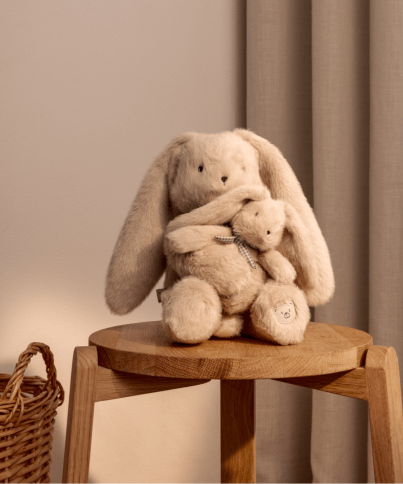 Velký a malý králíček Mommy & Baby, úžasná hračka z měkoučkého plyše. Králíčci by se mohli stát milovanou první hračkou, která vaše děťátko provede dětstvím. Dva samostatní králíčci, velký má z vnitřní strany tlapek suché zipy, aby mohl držet malého v objetí. S roztomilou výšivkou na tlapce.