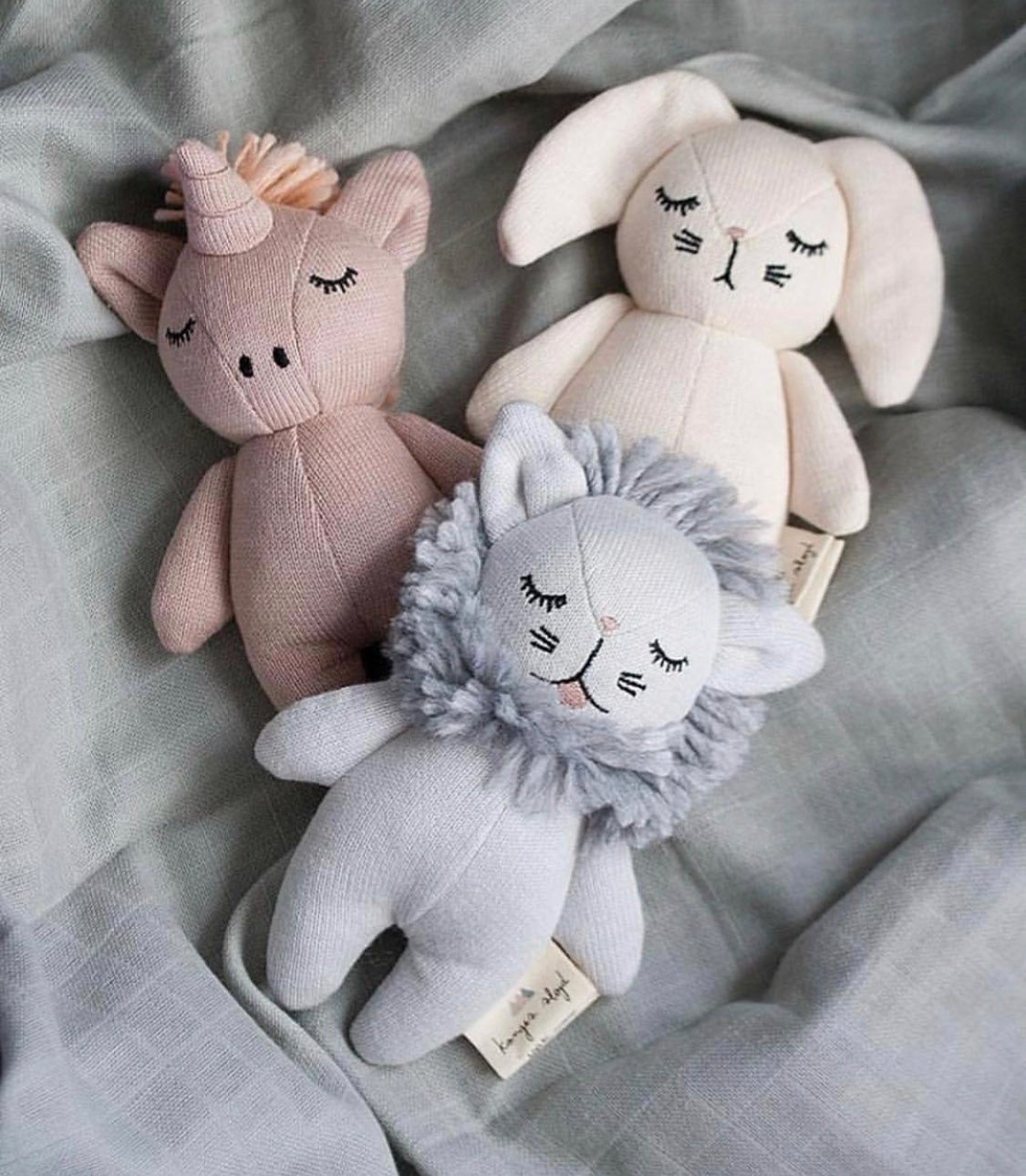Měkké hračky - lvíček, jednorožec a králíček - jsou vyrobeny ze 100% organické bavlny a skvěle padnou do dětských ručiček. Jsou tvarovány tak, aby je děti mohly snadno uchopit. Uvnitř hraček je malá rolnička, která děti zaujme a bude stimulovat jejich sluch.