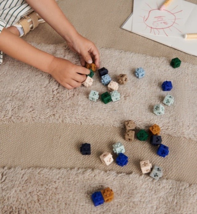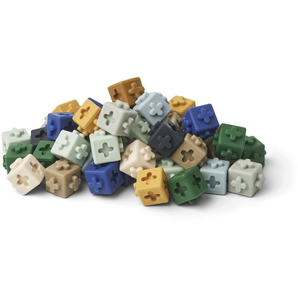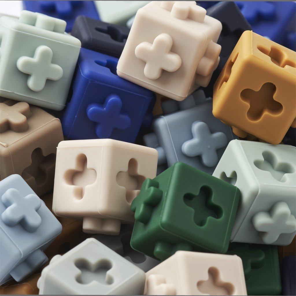 Sada barevných kostiček z příjemného 100% silikonu zaručuje hodiny kreativní hry, ať už na stole, nebo na podlaze.