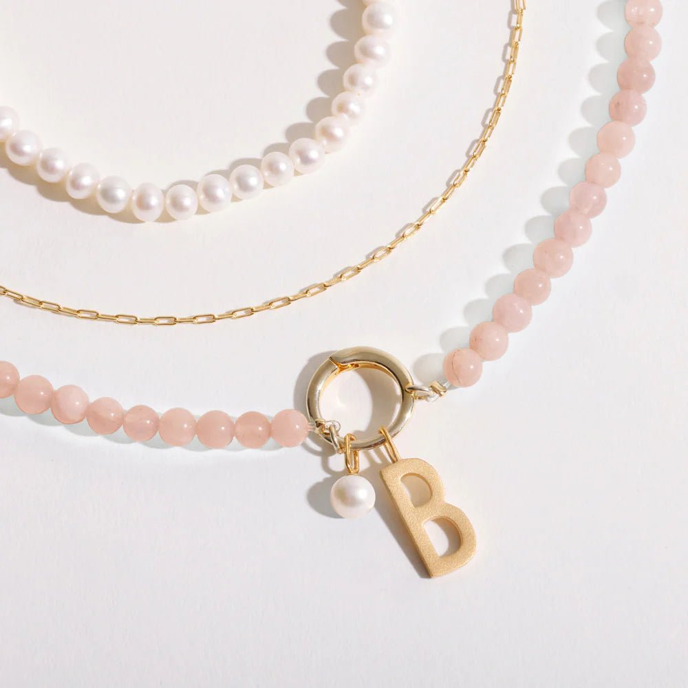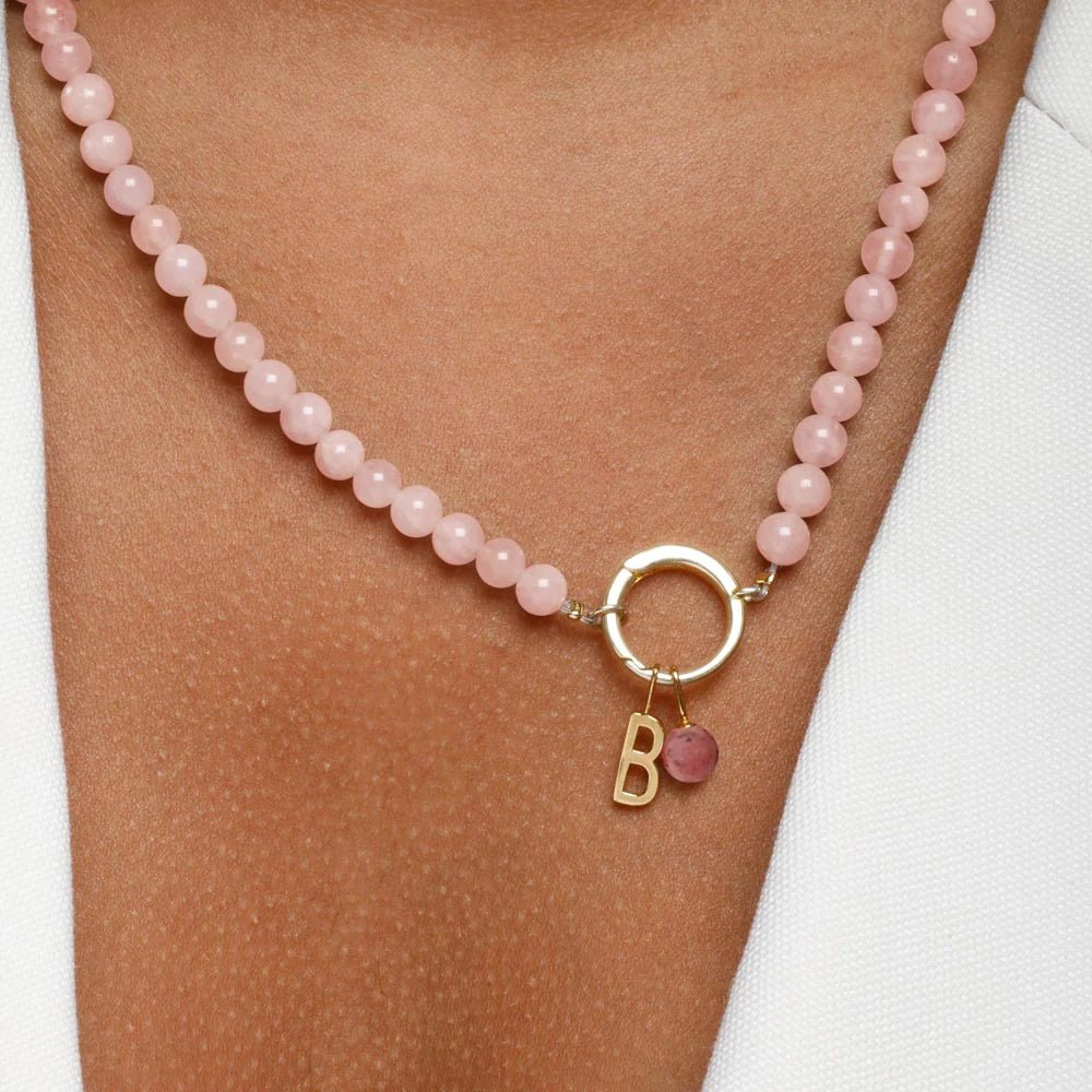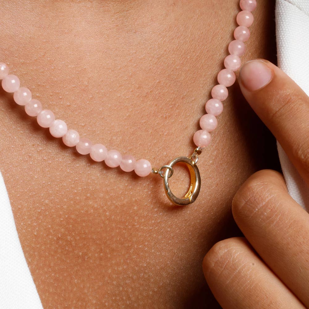 Krásný šperk z růžových opálů s velkým zlatým očkem, na které můžete připnout přívěsky Design Letters - písmenka a další - aby byl váš náhrdelník ještě osobnější. Šperk kombinuje drahokamy a detaily z pozlaceného stříbra.