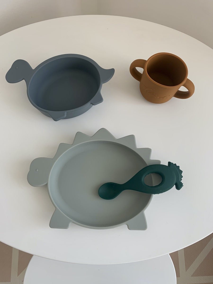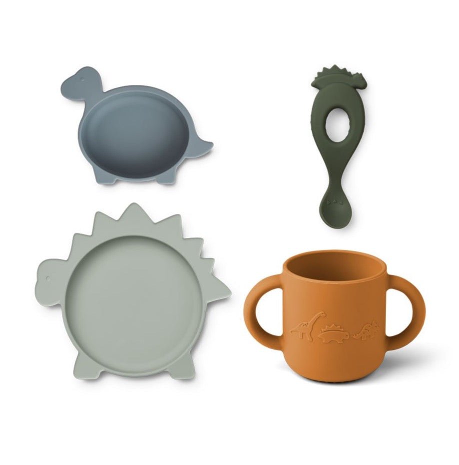 Čtyřdílná silikonová jídelní sada Liewood Vivi, primárně určená pro menší děti. Set obsahuje roztomilý talíř a misku se zvířecími oušky, kelímek s vytlačeným obrázkem zvířátka a lžičku s oušky. Stolování tak bude ještě veselejší. Nádobí v příjemných barvách z měkkého, ohebného silikonu, který se při pádu na zem nerozbije. Vhodné do myčky nádobí.