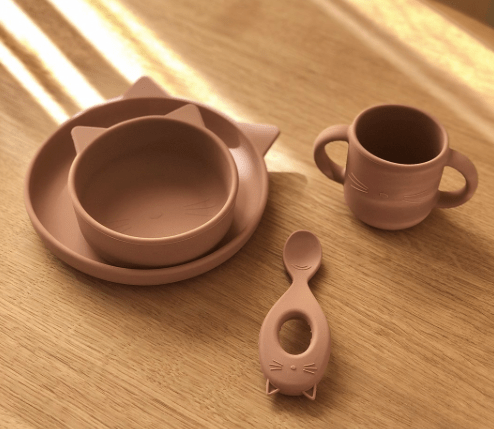 Čtyřdílná silikonová jídelní sada Liewood Vivi, primárně určená pro menší děti. Set obsahuje roztomilý talíř a misku se zvířecími oušky, kelímek s vytlačeným obrázkem zvířátka a lžičku s oušky. Stolování tak bude ještě veselejší. Nádobí v příjemných barvách z měkkého, ohebného silikonu, který se při pádu na zem nerozbije. Vhodné do myčky nádobí.