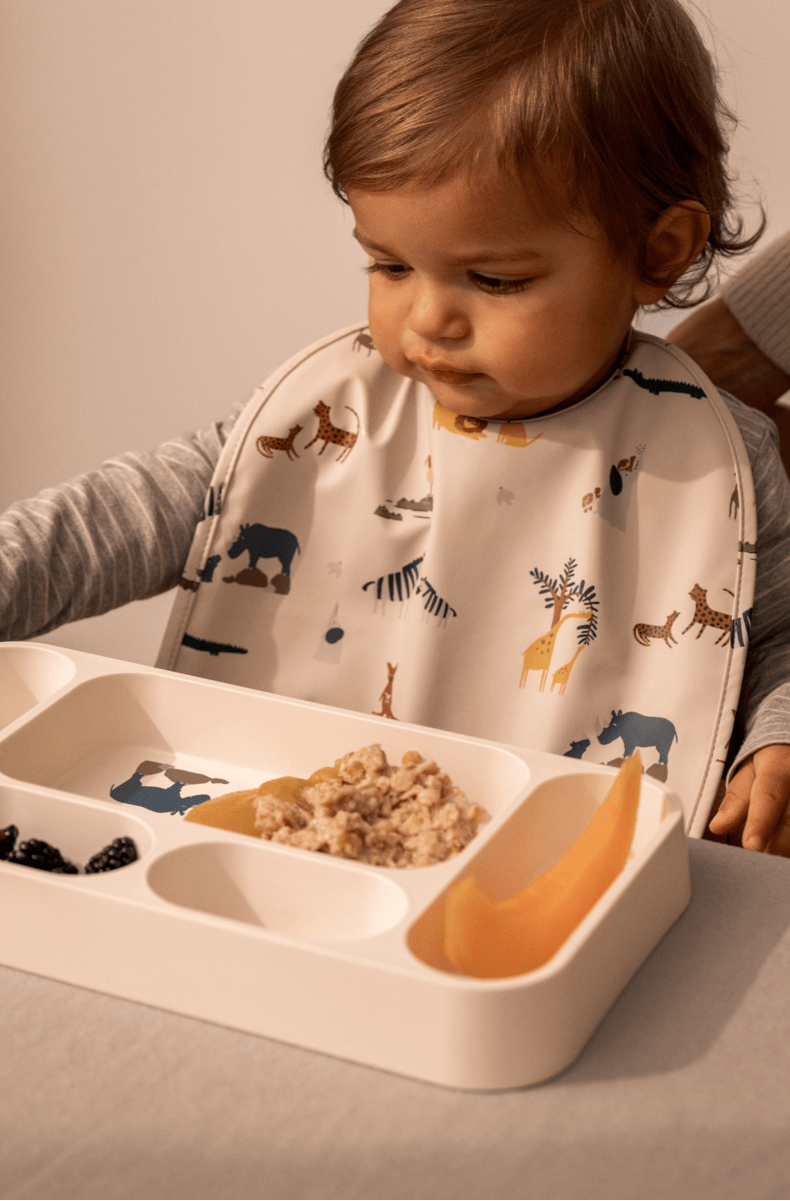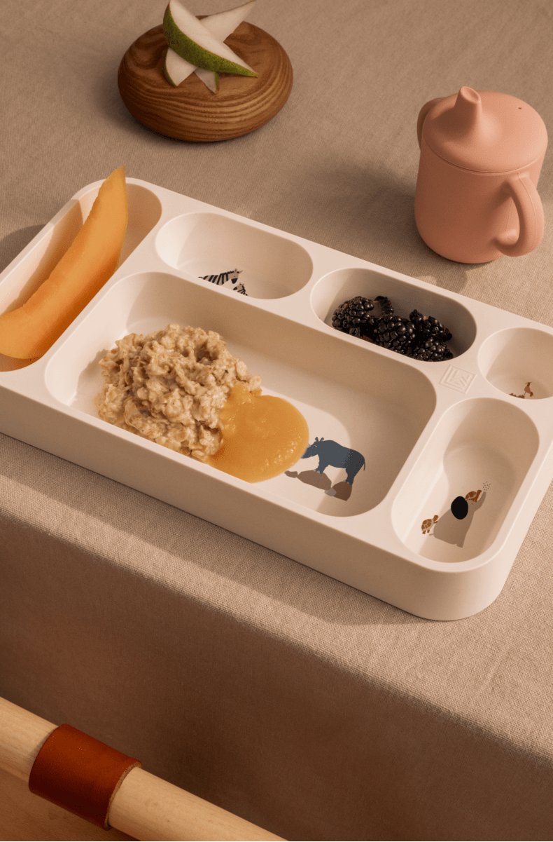Talíř - tác se šesti samostatnými oddíly, abyste dětem mohli servírovat jednotlivá jídla zvlášť a ony poznávaly jejich vzhled i chutě. Díky podlouhlému tvaru mají děti vše hezky před sebou na výběr a talíř je na stole stabilní. Pro děti od 6 měsíců, nebo když začínají samostatně jíst. Je vhodný do myčky nádobí.