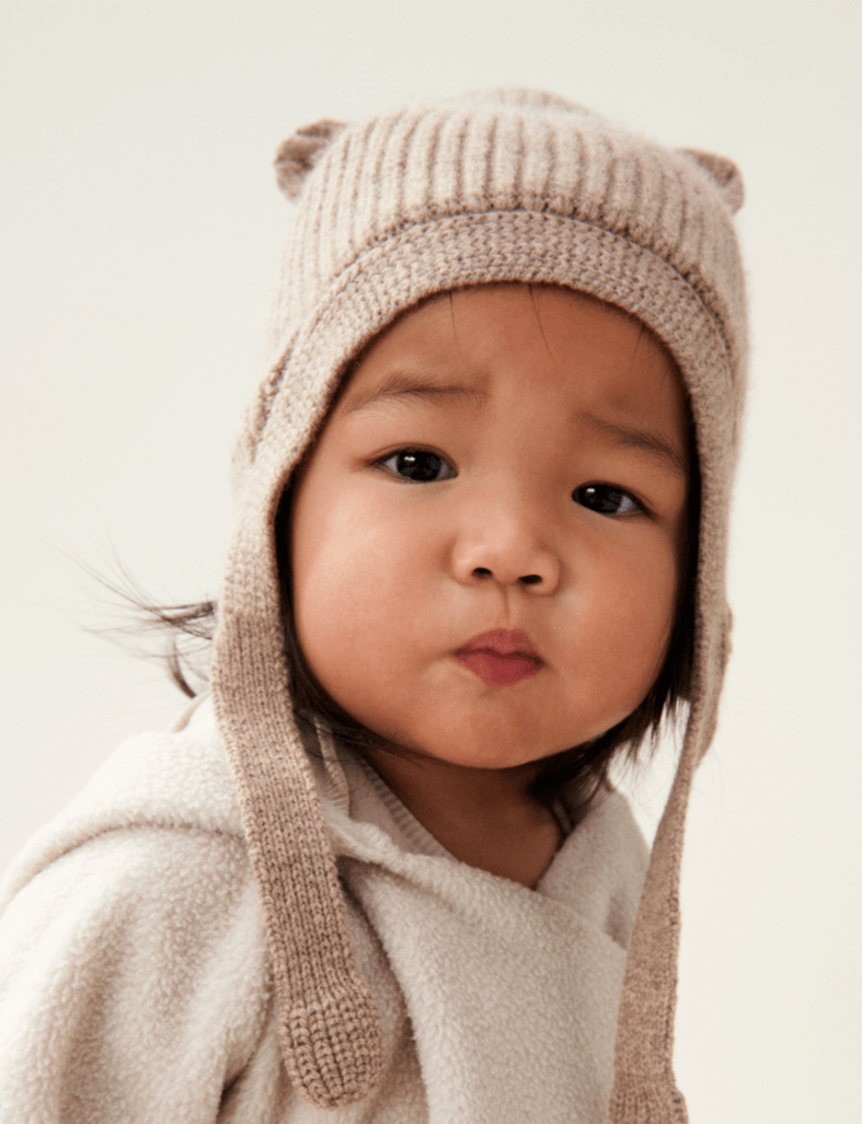 Čepice ze 100% vlny, designovaná tak, aby co nejlépe kryla uši. Krytí uší přechází do tkanic, kterými můžete čepici zavázat pod krkem. S roztomilými medvědími oušky a oblými zakončeními tkanic.