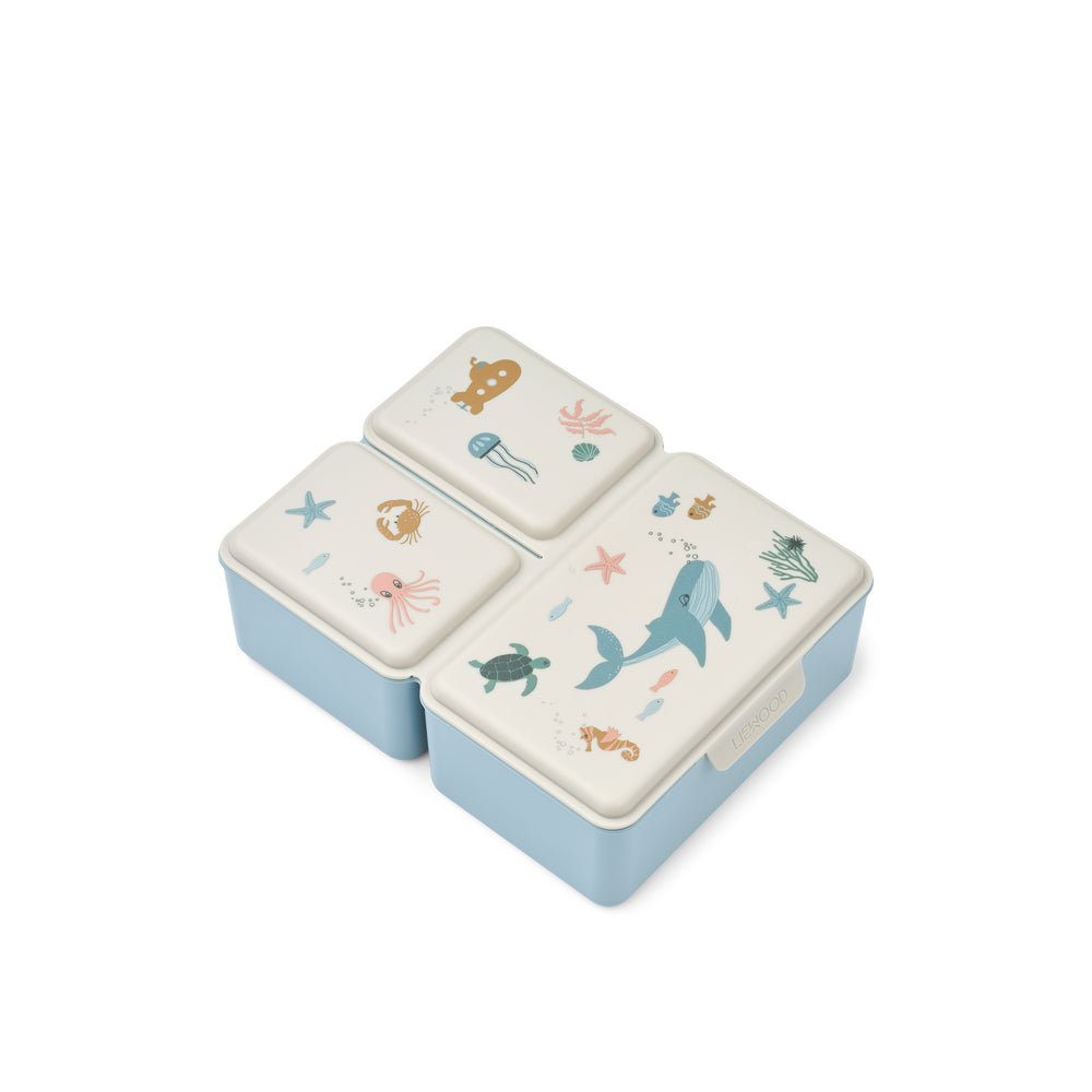 Trojdílný svačinový box. Každá část se otevírá zvlášť, což je praktické pro oddělení různých potravin a zároveň zábavné pro děti. Největší oddíl má vyjímatelnou přepážku pro další možné rozdělení. SVačinový box můžete mýt v myčce.